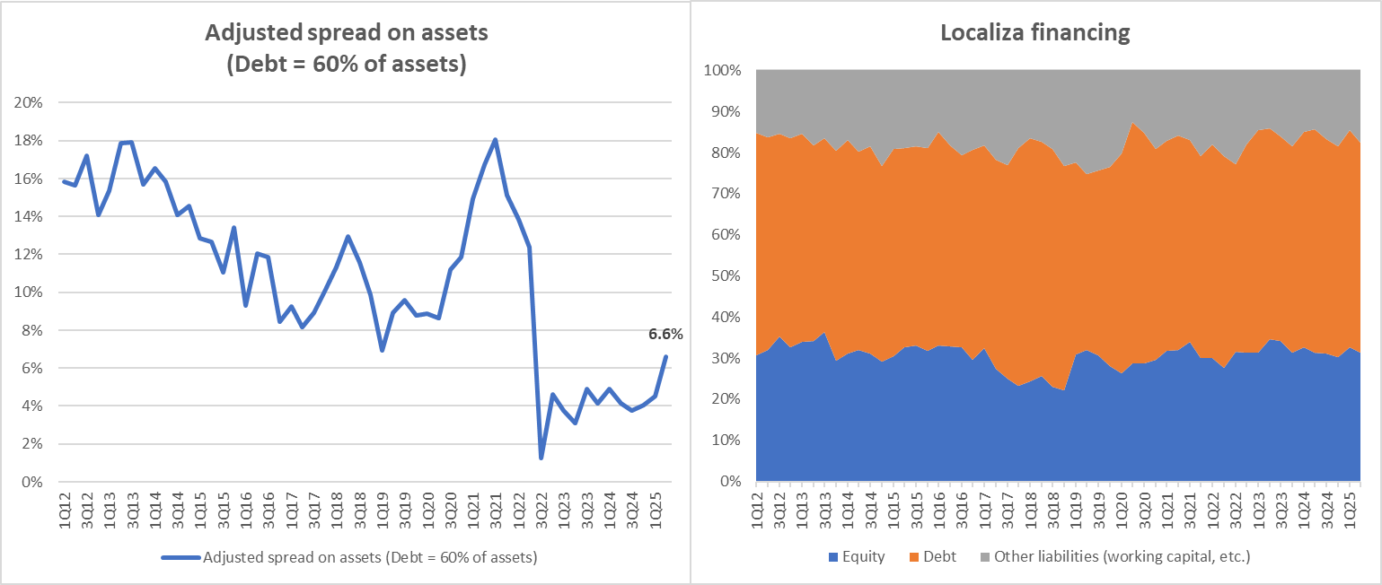 However, debt is only 60% of the company’s assets, therefore allowing the company to earn income via equity and other financing (net negative working capital). The company’s financing has been surprisingly stable over time, and in calls Localiza has explained that it expects to maintain net debt in the range of 50/60% of its fleet value. When we consider financing with 60% debt, the spread on assets is closer to HSD historically, with current figures around MSD.
