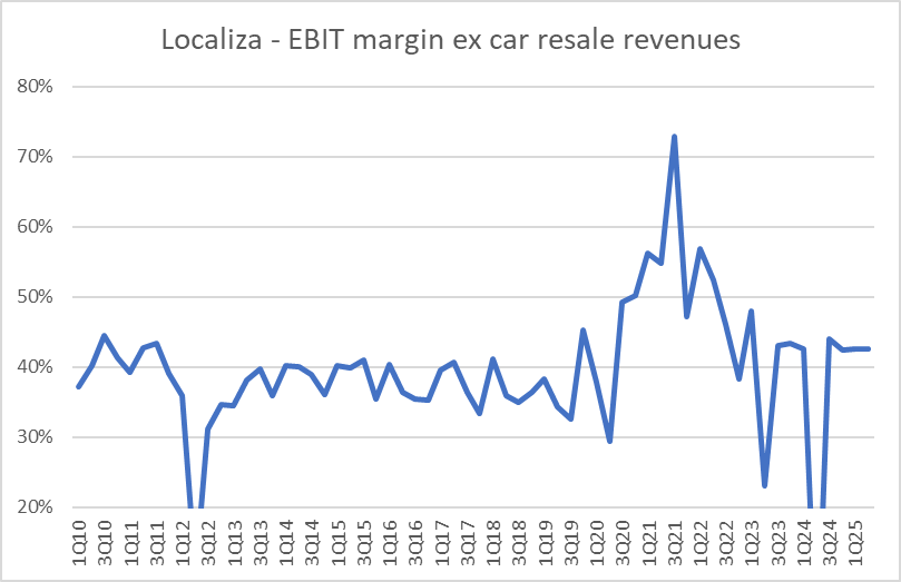 Analyzing these businesses purely on an operational basis does not make a lot of sense, because financing is an operational factor. Financing is both a determinant of competition, and a core ‘raw material’ for the business. Localiza has 40% EBIT margins, and yet it earns a very low spread on its capital (versus debt).
