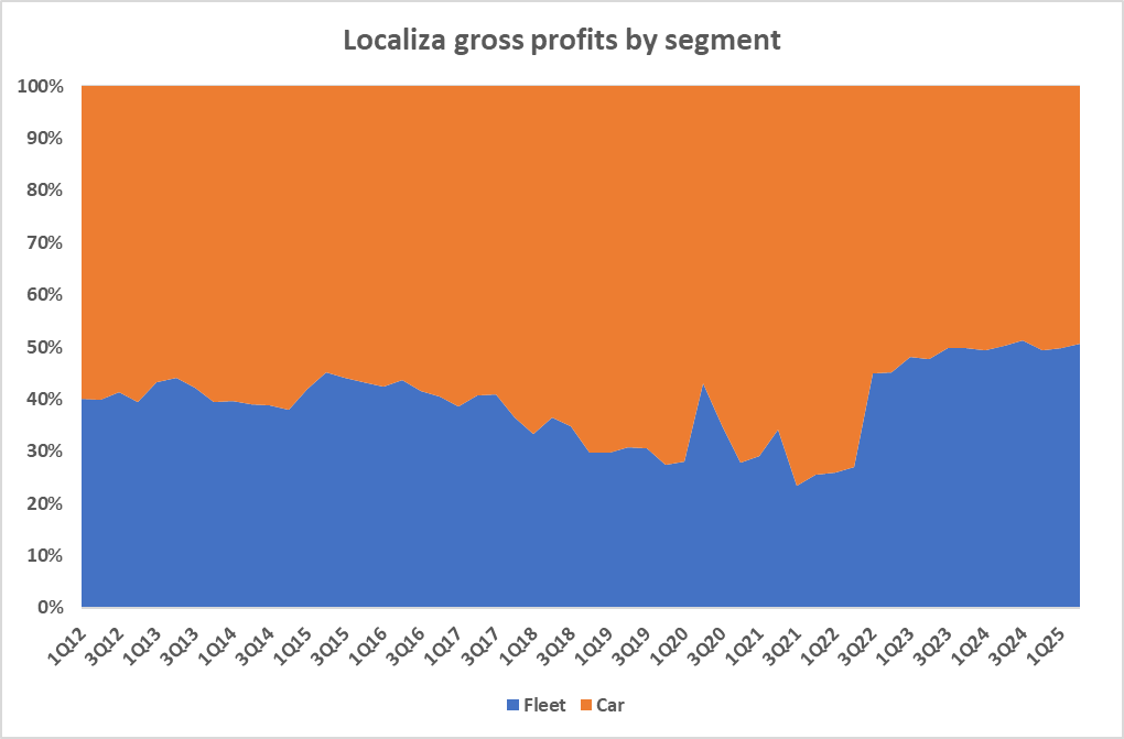 Localiza divides its business into two segments, based on the length of the contract: Car is short-term contracts, generally one or a few vehicles, and almost exclusively light vehicles (cars); Fleet is long-term, usually longer than a year contracts, renting more vehicles, and including vehicles other than cars, like trucks, or logistics vans.
