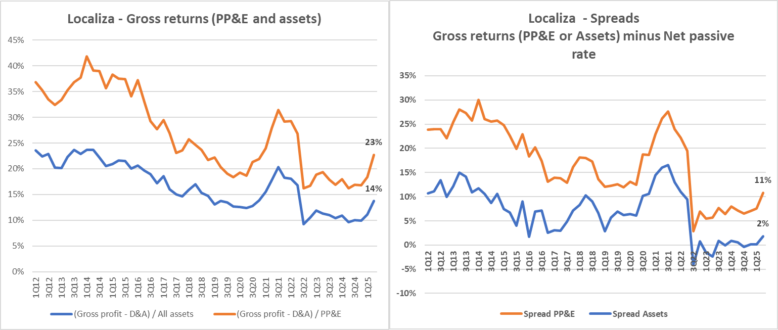 However, we still need to remove other expenses. First off, we need to consider that Localiza does not only own cars. We compared the ‘rate’ earned on cars above, because that is what the customer is approximately thinking about. However, Localiza requires other assets, including working capital, repair shops, etc. Historically, cars have been approximately 60/70% of Localiza’s asset base. When we consider all assets that need to be financed, the ‘gross return’ (gross profit - D&A) almost halves.