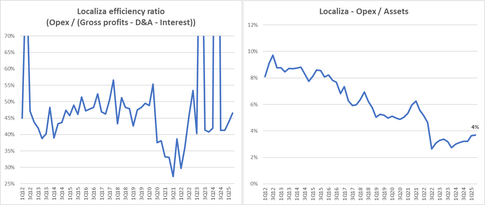 On the income statement, we should treat financing costs as one of the first items after revenue, just like banks do. Indeed, revenues could even be considered net of financing. All efficiency or turnover metrics should then be calculated over these net revenues. For example, for Localiza, SG&A over revenues or over assets shows a leveraging trend, but SG&A over income net of financing shows a very flat trend over more than 10 years.