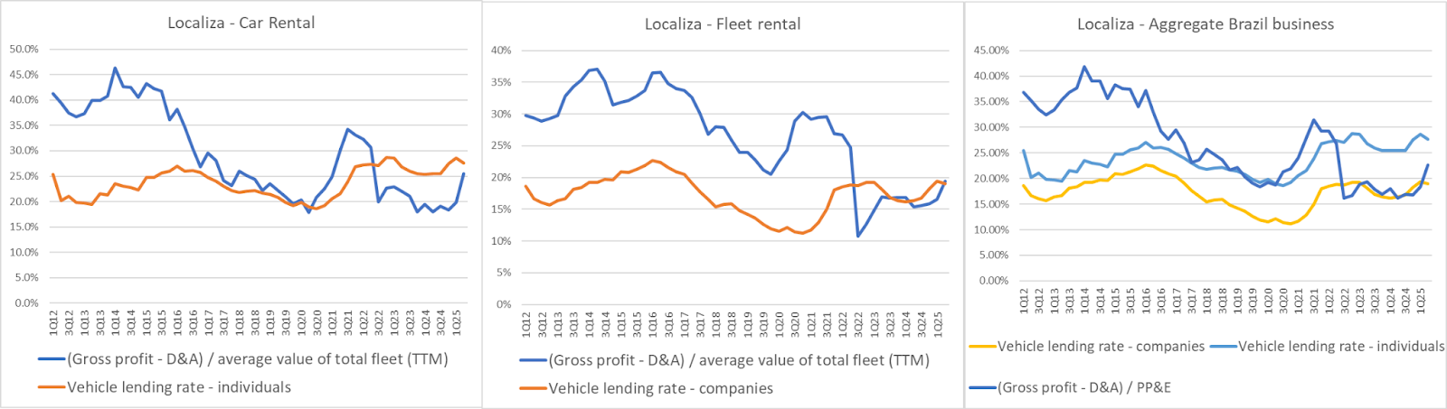 And indeed, we find evidence of this. The charts below show Localiza’s gross profit (to avoid accounting for the resale of vehicles) minus depreciation (accounting for the ‘principal repayment’ if debt financing, or equity loss if equity financed), over the average value of the fleet of vehicles, for each segment, and for the aggregate business in the last chart. It compares this with the active lending rates for vehicles in Brazil for individuals (Rental) and companies (Fleet).