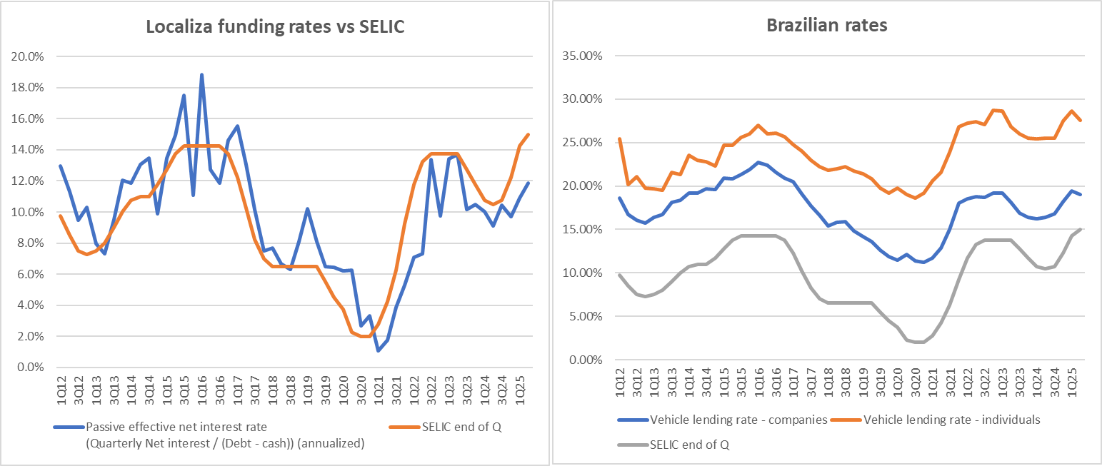 So far, this explains the active rate in banking, but what about the passive rate? Similar to a bank, Localiza can finance itself at close to the reference rate in Brazil (SELIC, left hand chart). As seen in the right hand chart, lending rates to vehicles in the Brazilian financial market move along with SELIC too.