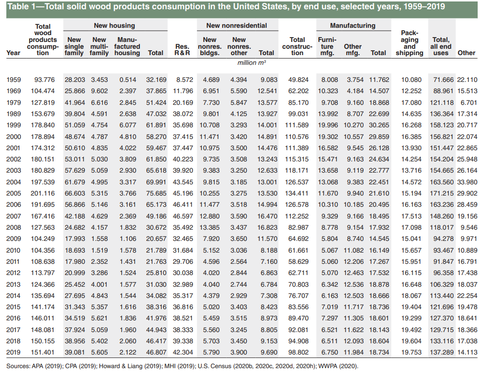 As mentioned, most wood demand comes from construction, at least 66% directly (USFS, 2019). The enormous majority of its is single-family and repair and remodelling.