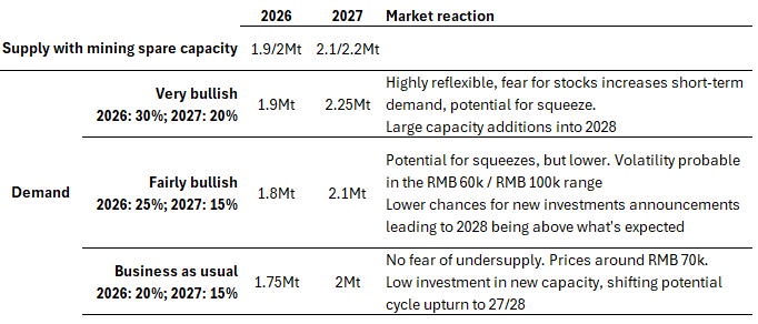 Given (1) the significant spare capacity available, particularly in mining and processing; and (2) the large increases expected for 2026, especially from China, Africa and Argentina, demand should be really bullish to get the market to balance before late 2027. This seems unlikely. Under even moderately conservative demand assumptions, the oversupply remains until 2028, when larger capacity additions are expected.