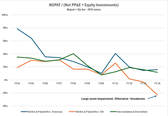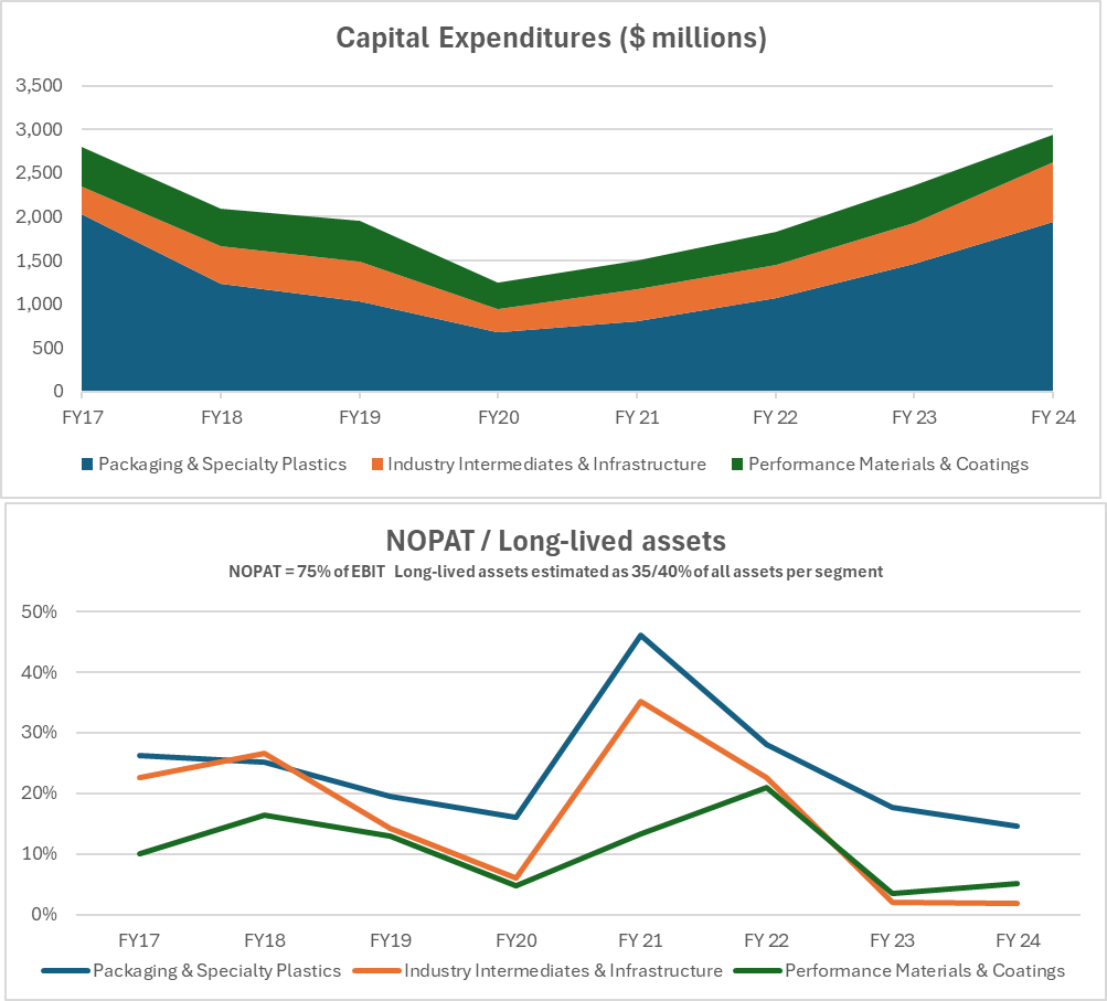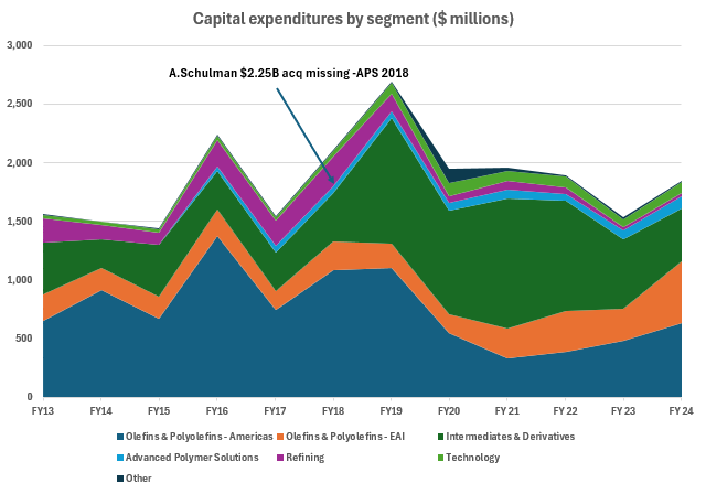 Maybe the company’s worst capital allocation decision was the acquisition of A. Schulman in 2018, which spurred the APS segment. This was a large investment of $2.25 billion, then about 4.5x EBITDA, but by 2022 the segment had lost 2/3s of EBITDA and was operating at breakeven in 2023/24.