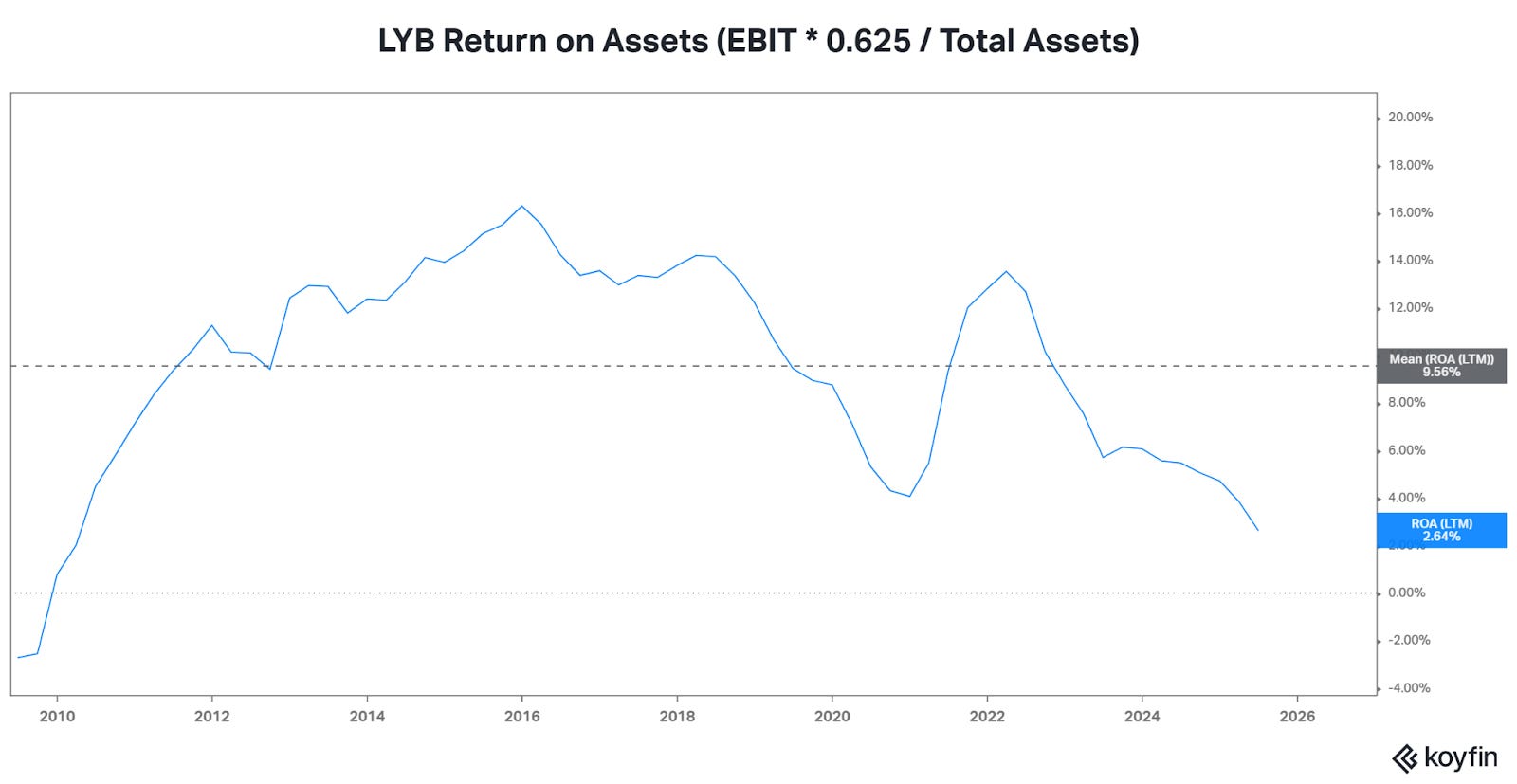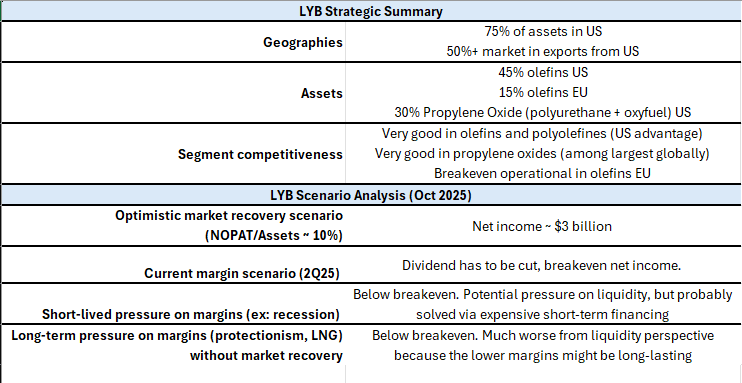 LYB is the result of the merger of Lyondell and Basell in 2007. Lyondell was a roll-up of chemical assets since the 1980s in the Texan basin, and Basell was a JV between BASF and Shell, which had combined assets mainly located in the Rhine basin (Benelux and Western Germany).