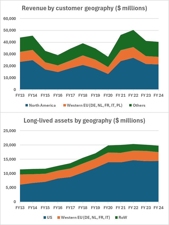 Given its history, it is not surprising that the company had most of its assets and customers in North America and Europe. Since the shale-revolution in the US, most growth investment has gone to capacity in the US.