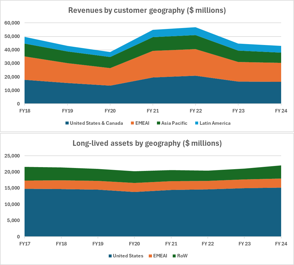 Again, we observe a company with assets concentrated in the US (75%), and with even a larger exposure to export markets, specially EMEA + India.