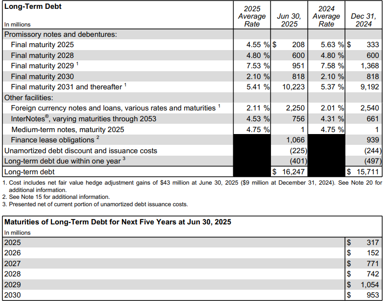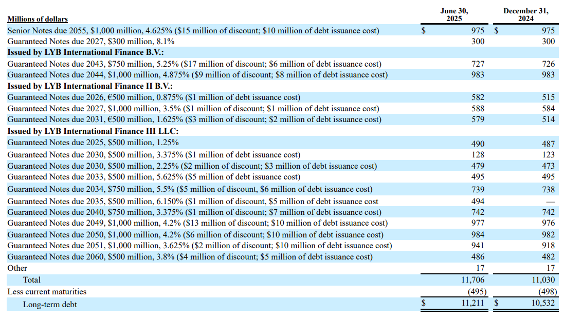 As of 2Q25, Dow faces very few maturities in the near term, as can be seen below, and most of its debt is fairly cheap in average terms.
