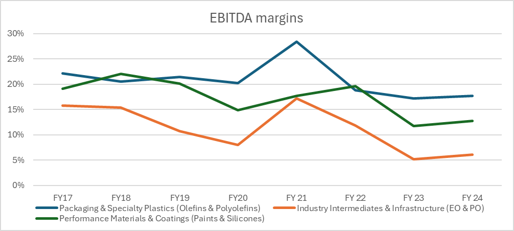 Dow also has exposure in relatively profitable specialty segments, acrylic binders (Coatings & Performance Monomers) and Silicones (Consumer Solutions), which remain profitable even today, even though their total contribution is not that large.