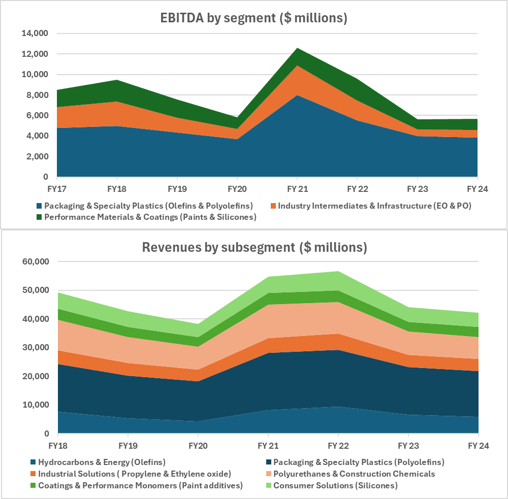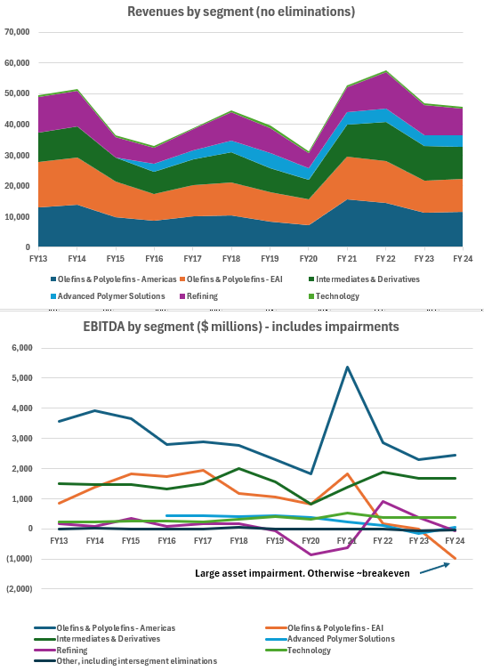 When we think of exposures, therefore, we come to similar realizations than to Lyondell, with more exposure to olefins. The Intermediates segment (propylene oxide -> polyurethanes; and ethylene oxide -> PET) is not as big, meaning lower exposure to construction, and potentially to vehicle fuels (via oxyfuel).