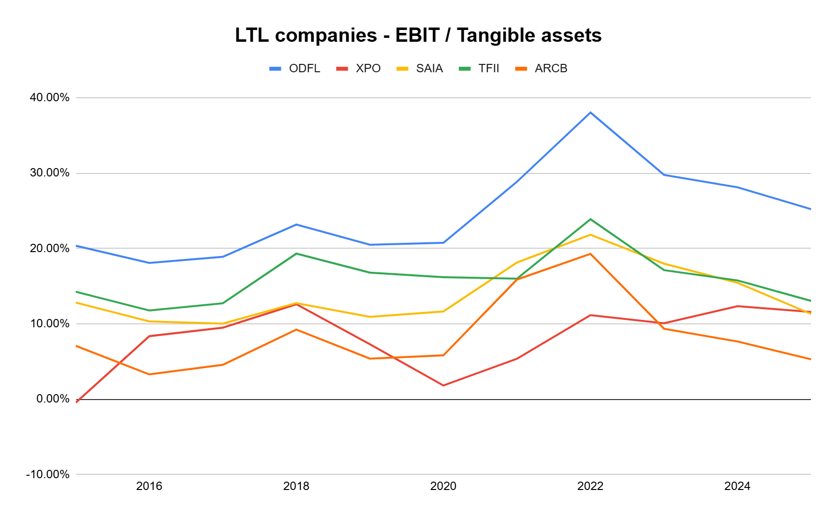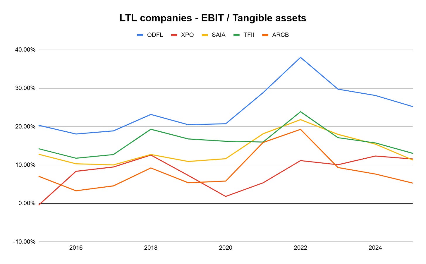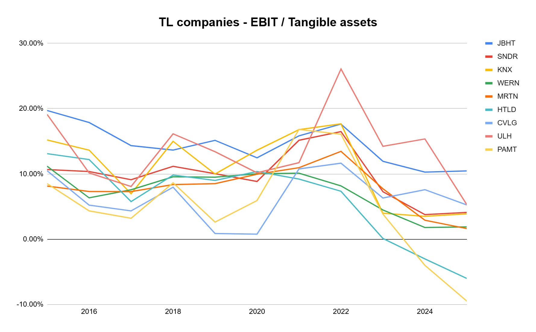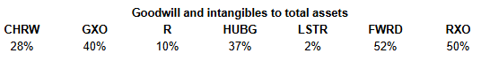 In some cases (RXO, FWRD, GXO), it is also the weight of intangibles and goodwill, coming from acquisitions, that depresses the return on assets. On a forward no-growth basis, intangibles and goodwill are not actually assets needed to run the business, but in reality, these companies tend to grow by acquisition, and therefore need to deploy capital to intangibles and goodwill. This is why I have used Total Assets instead of Tangible Assets for these companies.