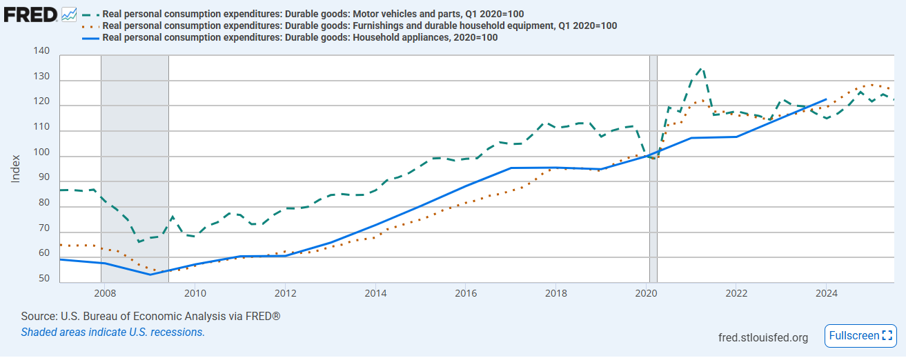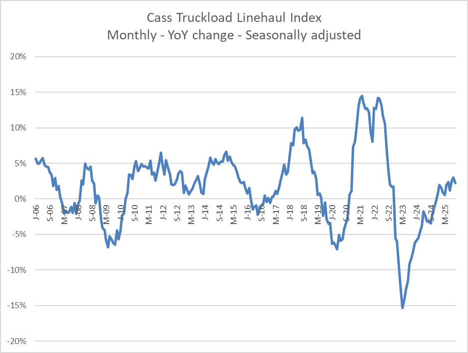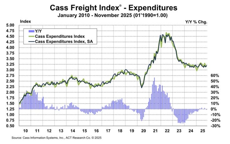 The volume of shipments (Cass Freight Index - Shipments) has been falling every month since January 2023. The aggregate volume of payments for freight services (for-hire and contract), captured by the Cass Freight Index - Expenditures below, shows a little more stabilization, but this includes the secularly upward force of inflation. Carrier and logistic operating margins were still decreasing as of 3Q25.