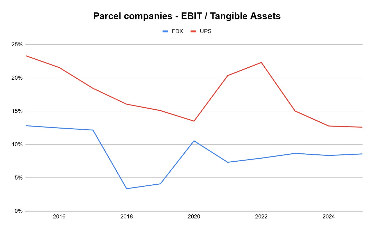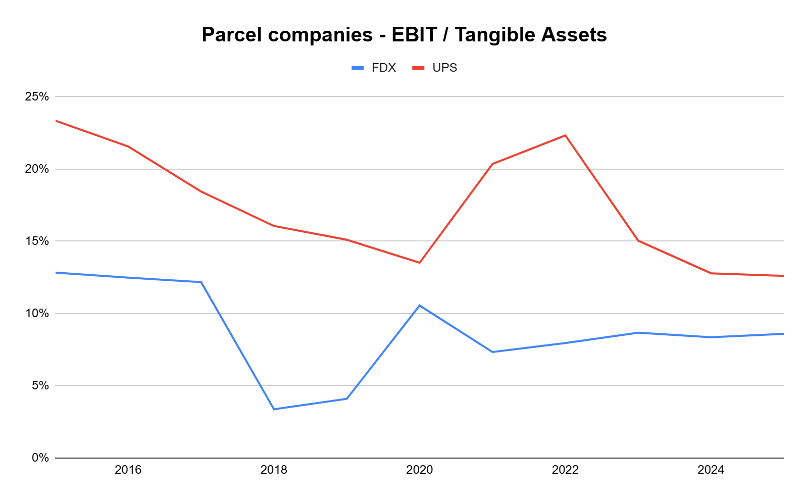 These should generate the highest returns on capital, but they don’t. Some reasons I can think of are some diseconomies of scale (too much granularity makes it hard to reach utilization, pushing on price competition to increase volumes), more transparent pricing, higher service expectations from the e-commerce economy, etc. Another one is the weight of leases (18% of the balance sheet for FedEx, 6% for UPS), which should be part of the denominator (they are assets needed for the operations of the business) but potentially not of the numerator (as the D&A recorded for ROU might actually be a compensation to capital).