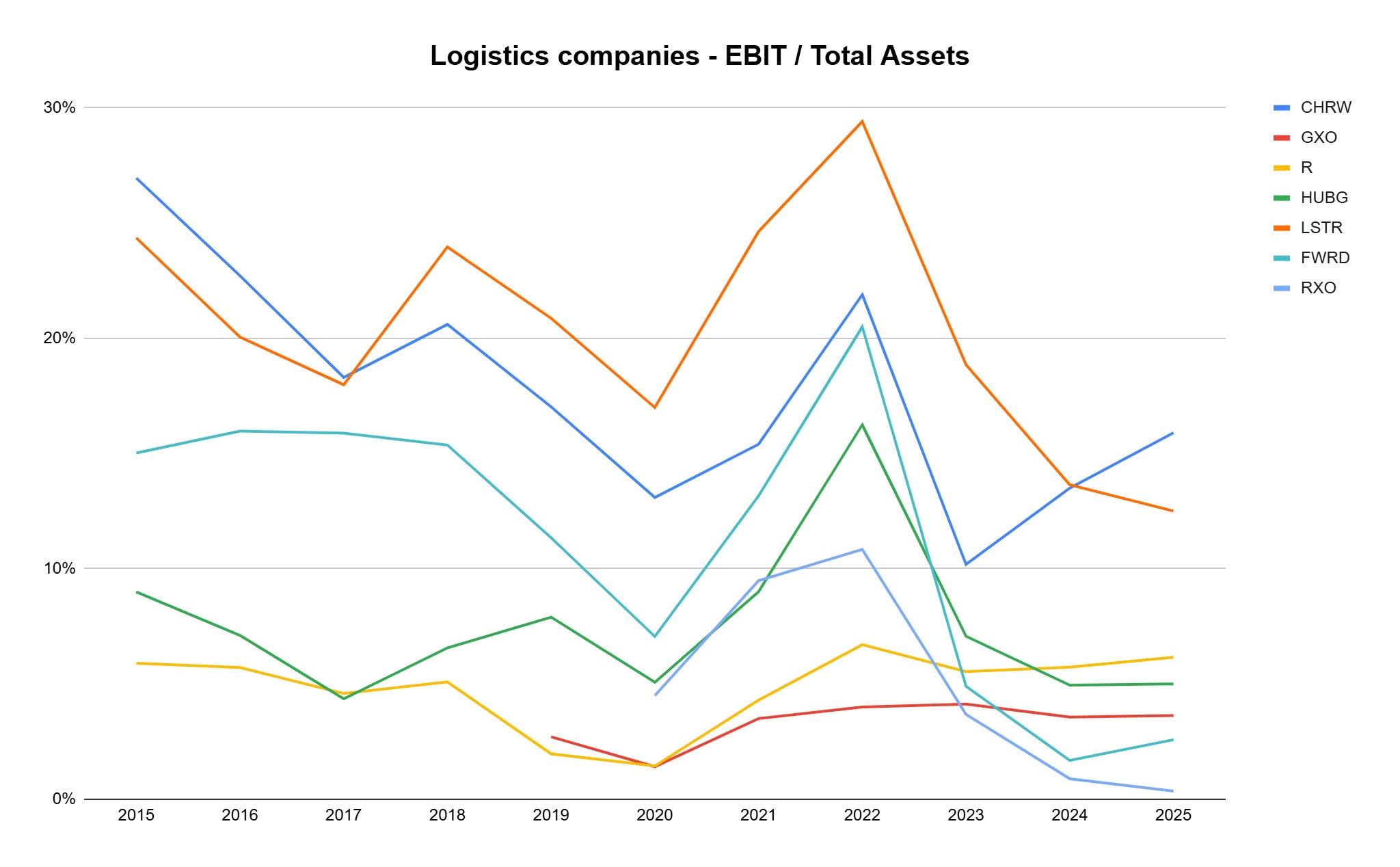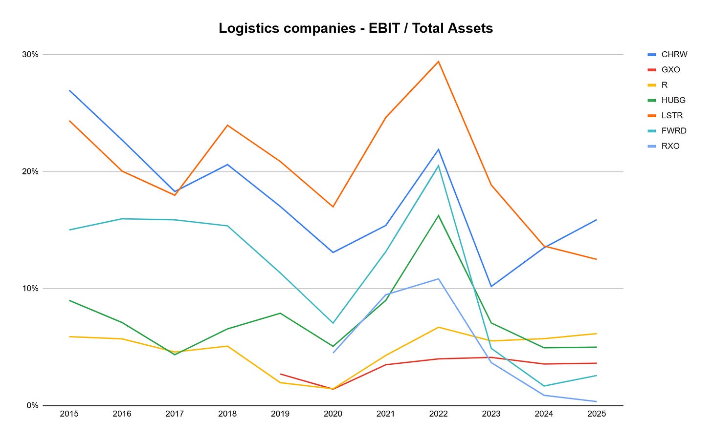 There are several subsegments, with most of the companies operating in several of them. Pure brokerage is maybe the more intangible, connecting shippers with carriers (CHRW, RXO, LSTR as purish-plays). Managed transport adds some more planning and freight admin work management for the shipper, something like a dedicated brokerage. Fulfillment and consolidation imply owning warehouses that can aggregate shipments, like a mini-LTL network, without the trucks, but still asset-intensive (GXO). There is also truck leasing (R as purish-play), which is asset-intensive but also not trucking per se. We can observe that high tangible-asset companies (GXO, R, HUBG) do not have the best returns on total assets.